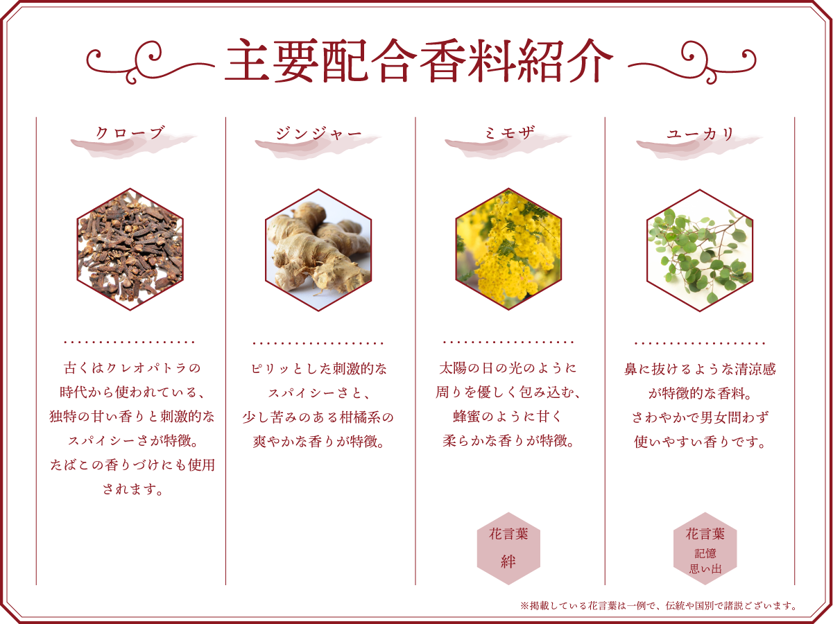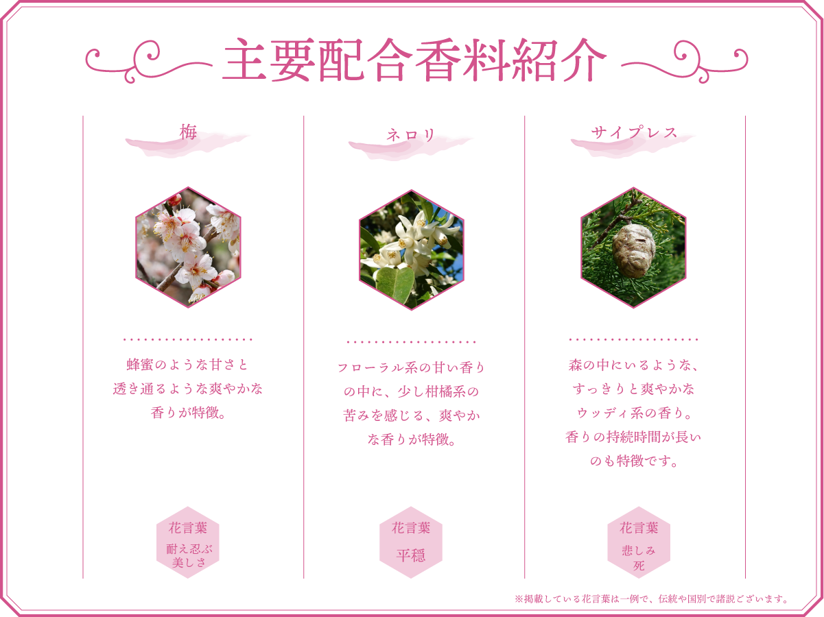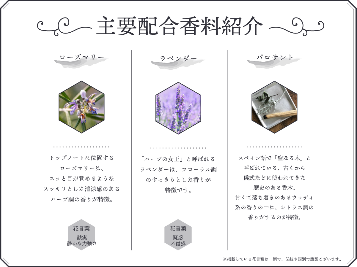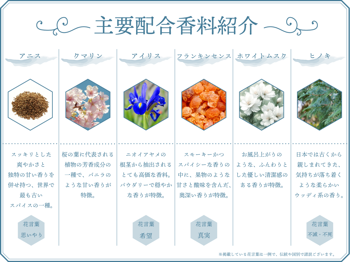 ホワイトムスクの柔らかい香りで家族や友を思い続ける鬼太郎の父のやさしさを、不死・不滅の花言葉のあるヒノキで幽霊族と物語の行く末を、感じさせます。