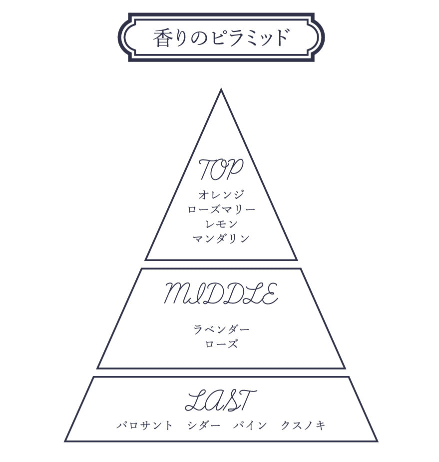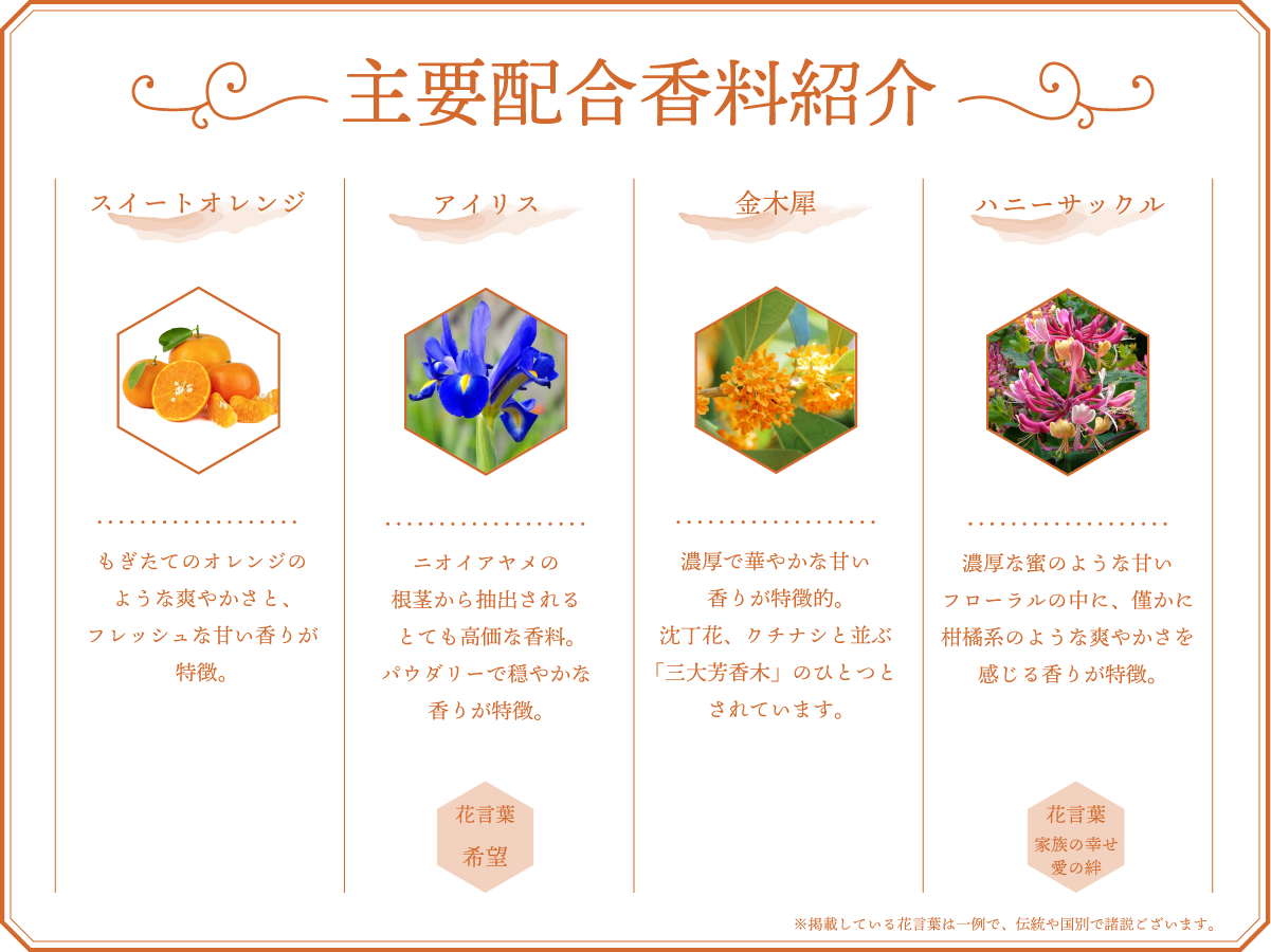 陽の香り→陰の香りと推移していく東洋医学等の仕分けに基づいて香料をブレンドしました。