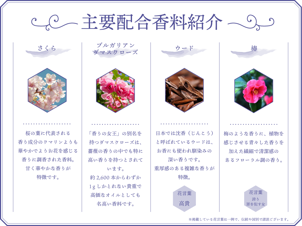 和装を身に纏い、凛とした姿勢で一族をまとめ上げる乙米を「さくら」で表現。優美な香りの中に管理している血桜がほのかににじみます。