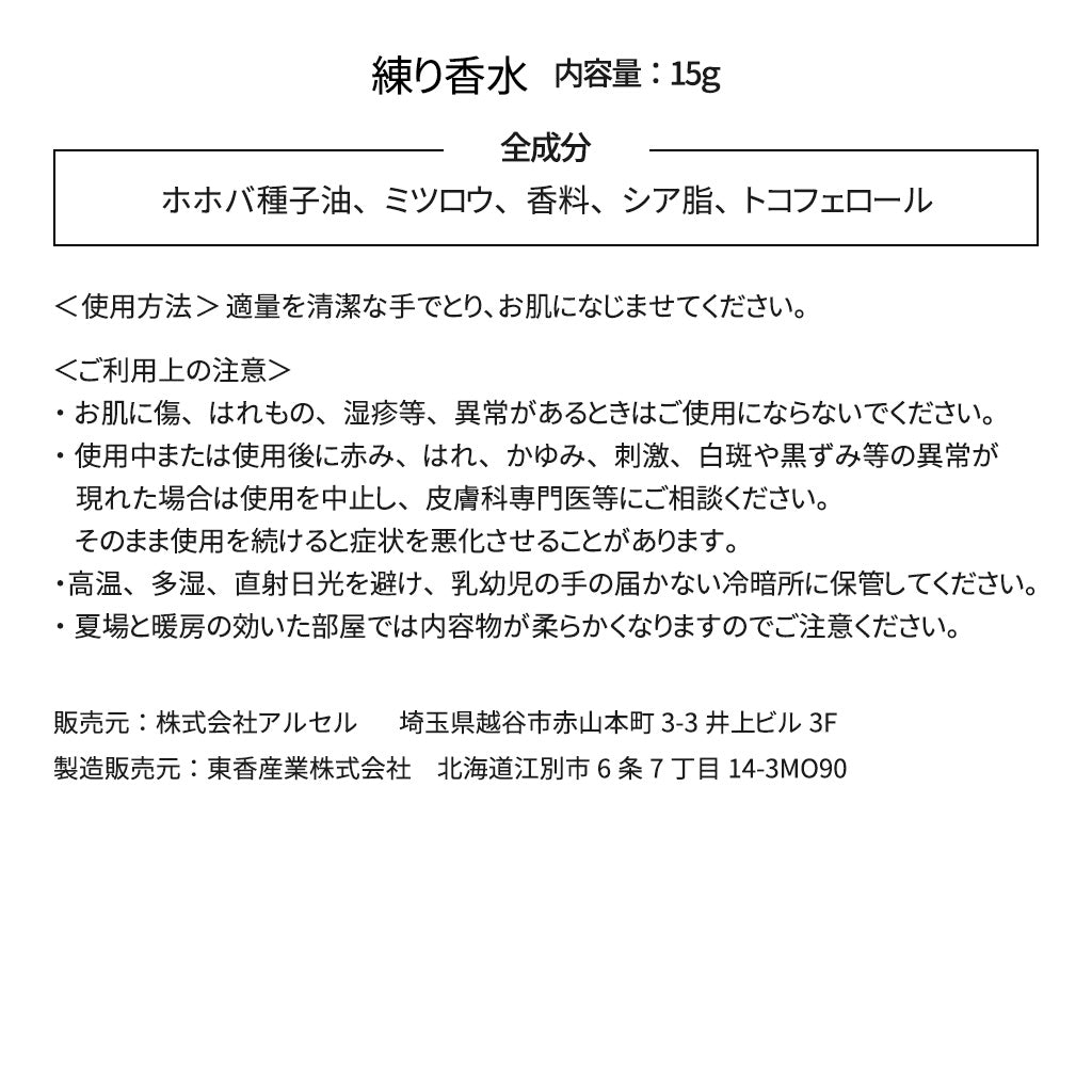 高級天然精油を贅沢に使用した6種の練り香水。それぞれの香りをイメージし、ストーリーになぞらえた花言葉を意識してトップ~ラストノートで表現しました。数多くの試作の末、遂に完成した調香師こだわりの香りをお楽しみください。