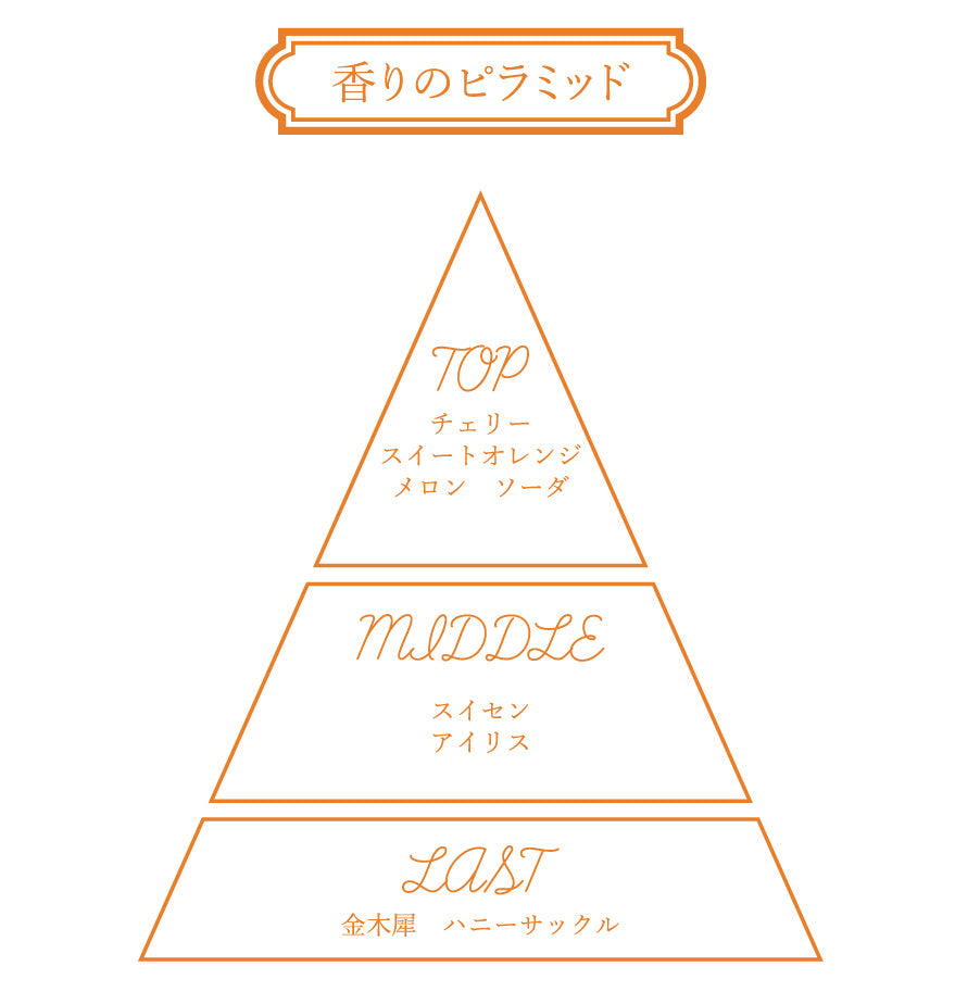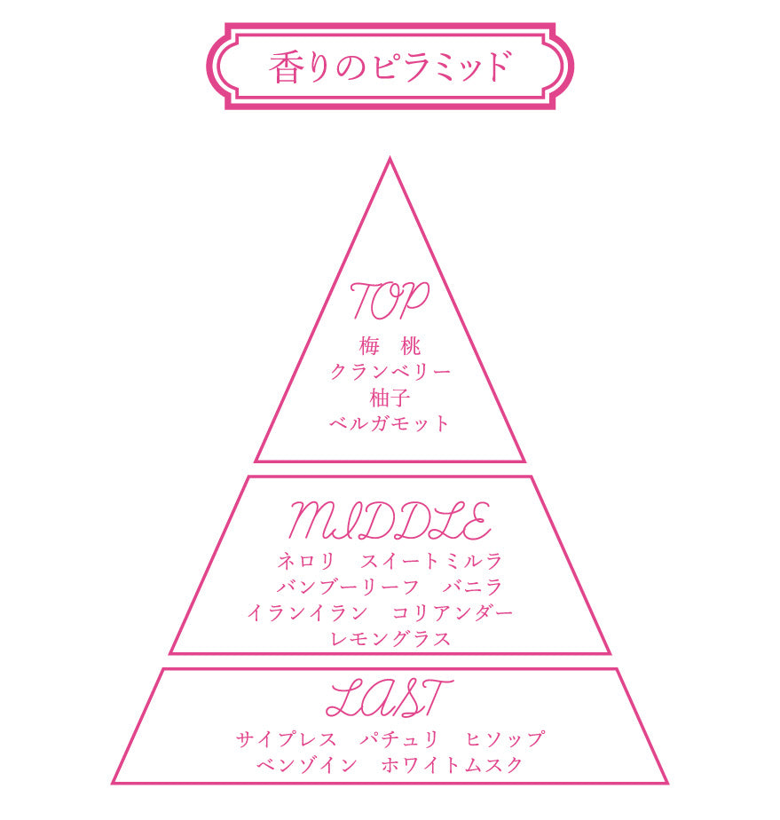 可愛らしさの裏に隠れる因果や、ただでさえ複雑な年ごろの少女の心境に加え結末への感情の揺らぎを表現する為に熟考した結果、最終的には16種類もの香料が複雑に絡み合う調香となりました。全体的な印象としてはラストノートに物悲しさがあるものの、可愛らしい少女の香りとして仕上がっています。