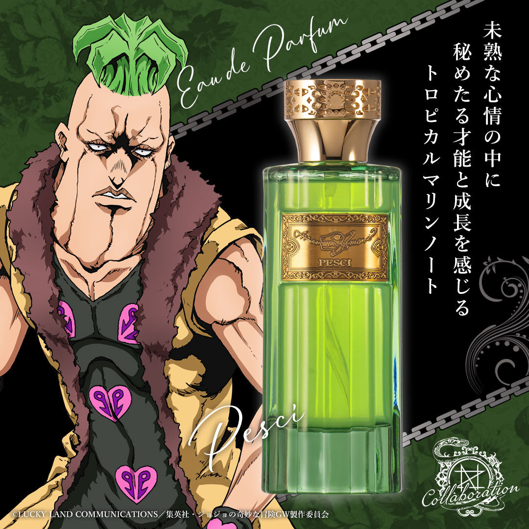 偏執的な行動やクセの強いスタンド能力を意識した、「ディ・モールト(非常に)」個性際立つ香りです。メロンのフルーティーさと、チュベローズやジャスミンなどの花々の魅惑的な香りが際立つ、甘くセクシーな調香です。