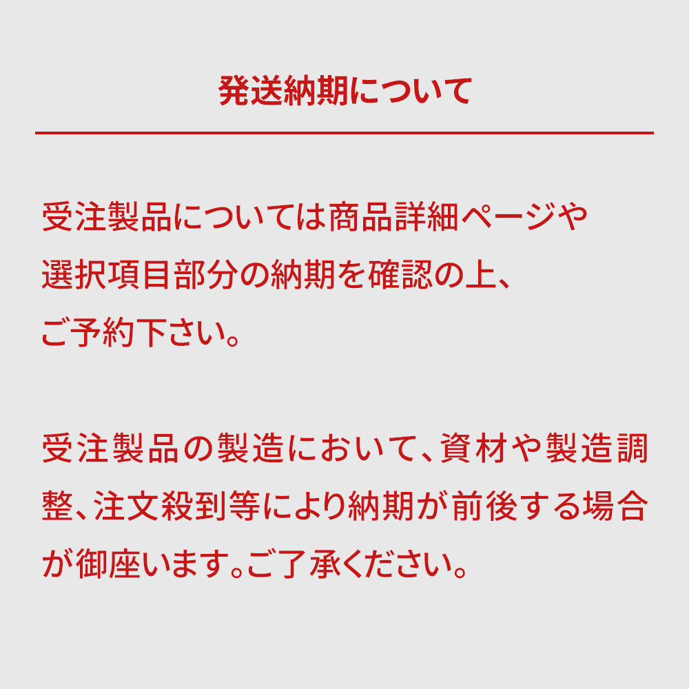 受注製品の製造において、資材や製造調整、注文殺到等により納期が前後する場合が御座います。ご了承ください。